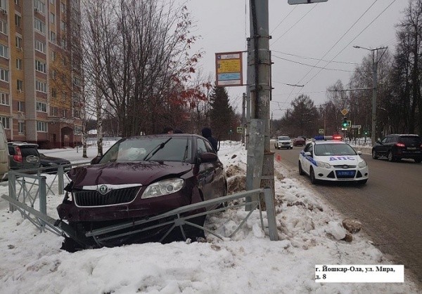 В пятницу, 10 января, около 09:30 у дома №8 на улице Мира в Йошкар-Оле 44-летняя водитель Skoda Fabia не выбрала безопасную скорость, не учла дорожные и погодные условия, из-за чего не справилась с управлением и врезалась в сугроб, а позже «притормозила» о металлическое ограждение. Женщине назначили амбулаторное лечение.
