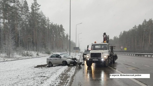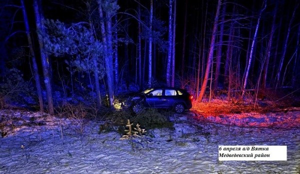 В этот же день в одиннадцать часов вечера на 81 км автодороги Вятка Медведевского района водитель автомашины Toyota также не выбрал безопасную скорость в сложных погодных и дорожных условиях. Он не справился с управлением, съехал с дороги и врезался в дерево. В результате аварии телесные повреждения получила пассажирка иномарки, которую с травмами отвезли в больницу.