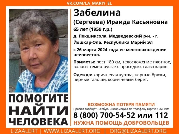 Поисковый отряд "ЛизаАлерт" разыскивает жительницу деревни Пекшиксола и Йошкар-Олы по следующим приметам: рост 180 см, плотное телосложение, темно-русые с проседью волосы, карие глаза. Одета в коричневую куртку, черные брюки, черные галоши и коричневый берет. А не так давно насильник напал на девушку в парке Йошкар-Олы и угрожал ей убийством.
