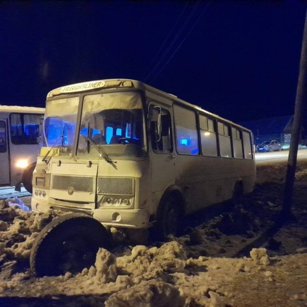 В 19:10 пассажирский автобус ПАЗ, которым управлял 59-летний мужчина, не выбрал безопасную скорость движения, не справился с управлением и съехал с дороги. Там он наехал на снежный вал.