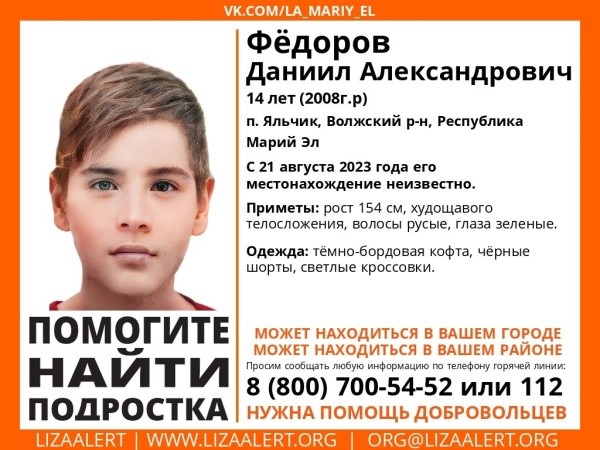 В пресс-центре поискового отряда «ЛизаАлерт» Республики Марий Эл сообщили, что Даниил Александрович Федоров живет в поселке Яльчик Волжского района. В последний раз его видели в понедельник, он был одет в темно-бордовую кофту, черные шорты и светлые кроссовки.