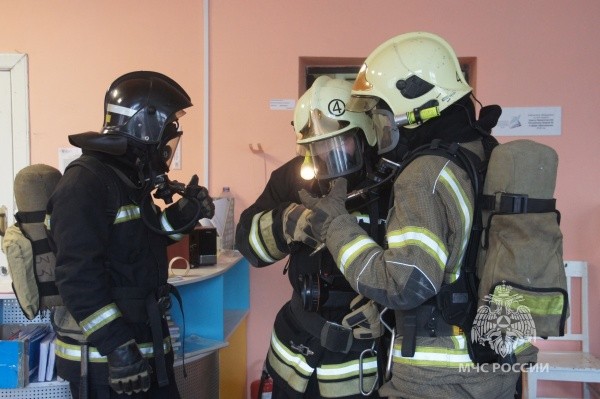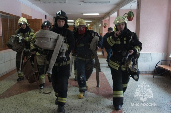По легенде учений огонь разгорелся в библиотеке на первом этаже школы в результате аварийной работы электроприборов. Пожарные провели разведку в «горящем» здании и ликвидировали условное пламя. Условных пострадавших вывели в безопасное место при помощи спасательных устройств типа “капюшон”.