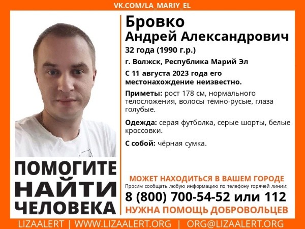 Пропал 32-летний житель Волжска Андрей Александрович Бровко. Его местонахождение неизвестно с 11 августа.