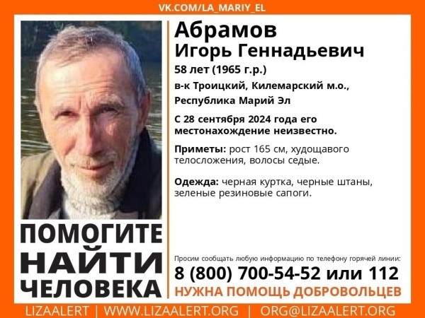 Местонахождение 58-летнего Игоря Геннадьевича Абрамова неизвестно с 28 сентября.