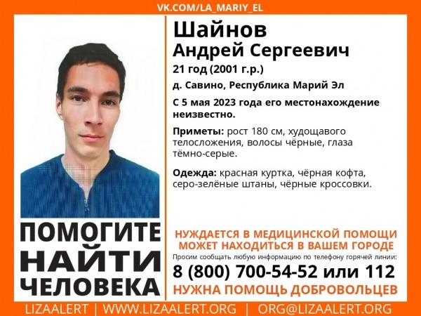 Местонахождение Андрея Сергеевича Шайнова неизвестно с 5 мая. 21-летний парень - из деревни Савино. Его приметы: рост 180 см, худощавого телосложения,  волосы черные, глаза темно-серые. На нем была красная куртка, черная кофта, серо-зеленые штаны и черные кроссовки.
