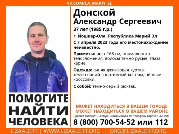 37-летний Александр Сергеевич Донской пропал 7 апреля. Его приметы: рост 168 см, нормального телосложения, волосы русые, глаза карие. Мужчина был одет в синюю джинсовую куртку, темно-синий спортивный костюм, черные кроссовки. С собой у него был темно-серый рюкзак.