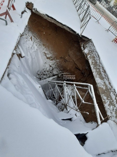 Вчера вечером, 28 марта, йошкаролинцы, проходившие по улице Красноармейской возле Вознесенского моста, были неприятно удивлены открывшимся видом: на противоположной от Вознесенского собора стороне обвалился тротуар.