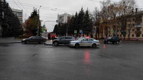 Сегодня утром, около 7:10, на перекрестке улиц Панфилова и Советской столкнулись машины Лада Калина, Nissan и пассажирский автобус.