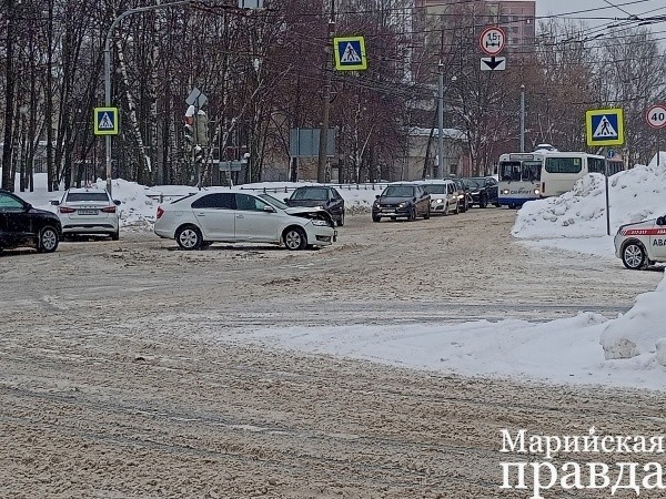 Как рассказали очевидцы «Марийской правде» учебный автомобиль «Лада» столкнулся на перекрестке с другой машиной, капот которой сильно повредился от удара.