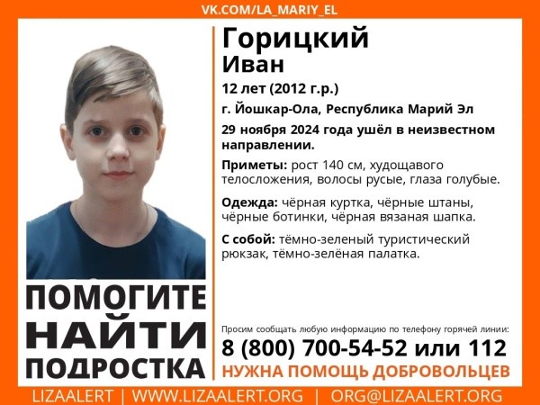 Поисковый отряд «Лиза Алерт Марий Эл» просит помощи в поисках 12-летнего Ивана Горицкого.