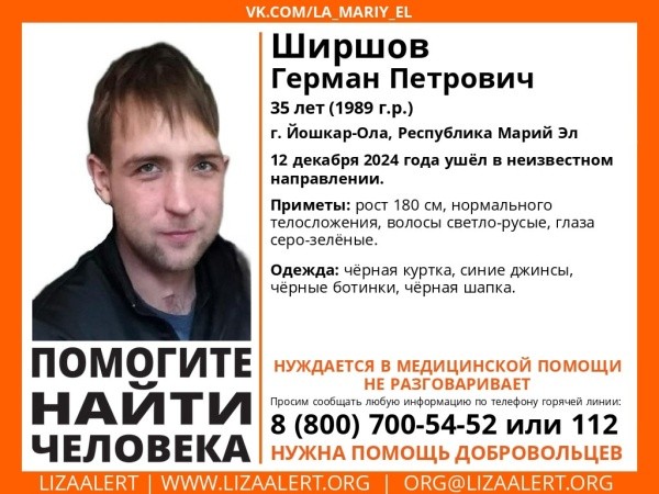 Поисковый отряд "ЛизаАлерт" разыскивает жителя Йошкар-Олы по следующим приметам: рост 180 см, нормальное телосложение, светло-русые волосы, серо-зеленые глаза. Одет в черную куртку, синие джинсы, черные ботинки и черную шапку.