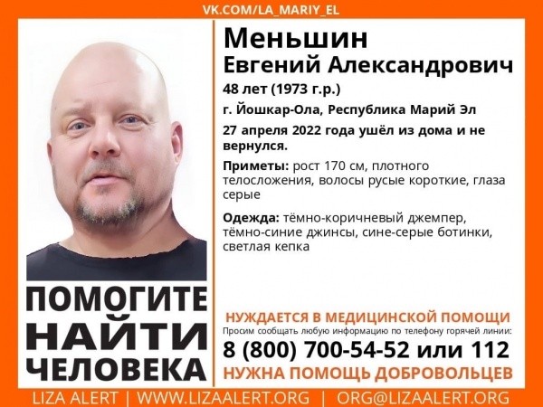 Как сообщили в поисково-спасательном отряде "Лиза Алерт", Евгений Александрович Меньшин 27 апреля ушел из дома и не вернулся. Его приметы: рост 170 см, плотного телосложения, волосы русые короткие, глаза серые. Был одет в темно-коричневый джемпер, темно-синие джинсы, сине-серые ботинки и светлую кепку.