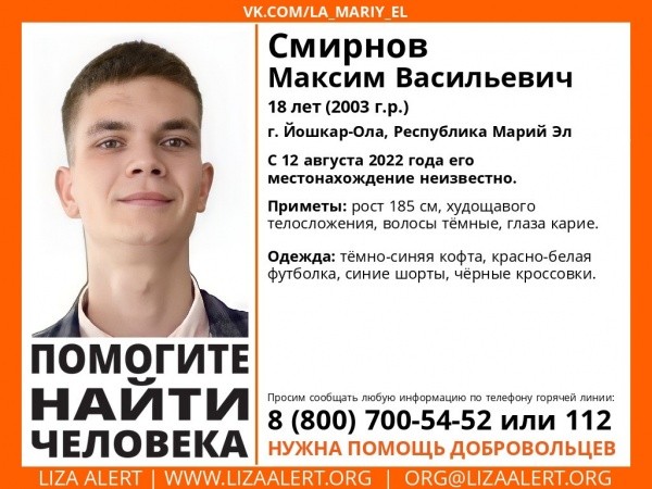 В Йошкар-Оле разыскивают 18-летнего Максима Смирнова. Его местонахождение неизвестно с 12 августа.