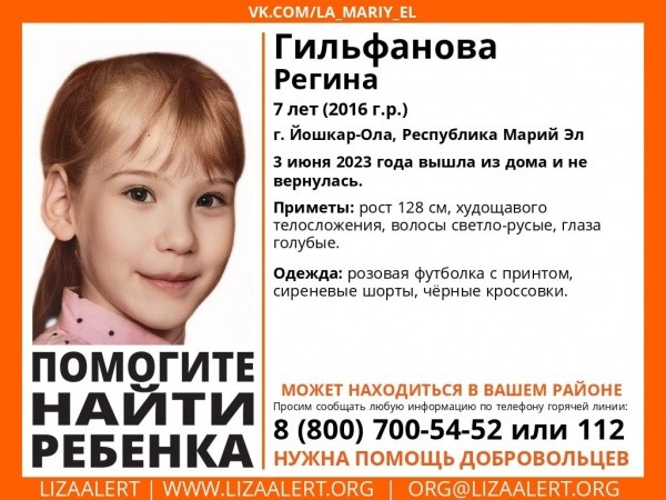 В Йошкар-Оле разыскивается 7-летняя Регина Гильфанова, сообщает отряд «ЛизаАлерт» в Марий Эл.