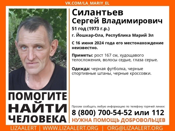 Поисковый отряд "ЛизаАлерт" Марий Эл разыскивает Сергея Владимировича Силантьева по следующим приметам: рост 167 см, худощавое телосложение, седые волосы, серые глаза. Одет в черную футболку, черные спортивные штаны, черные кроссовки.