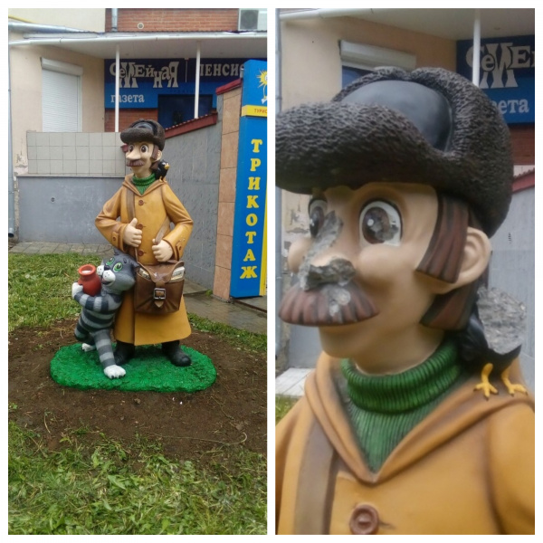 Памятник Печкину появился в Йошкар-Оле буквально на этой неделе, но, к сожалению, «продержался» всего три дня. Вандалы отломили голову галчонку Хватайке и испортили лицо самого почтальона.