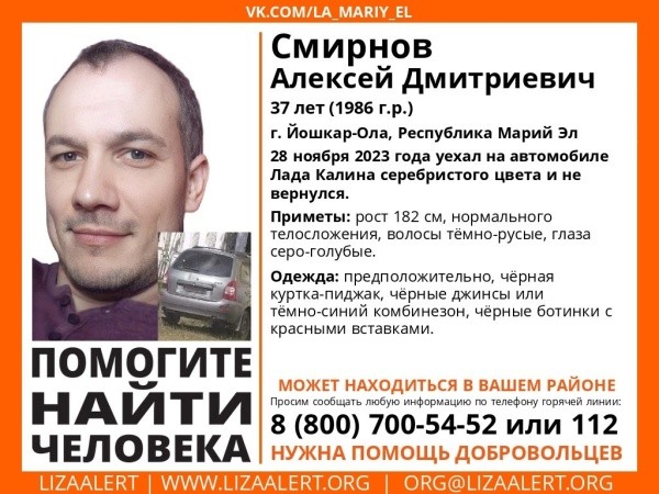 Местонахождение 37-летнего Алексея Дмитриевича Смирнова неизвестно с 28 ноября. Он уехал на автомобиле «Лада Калина» серебристого цвета и не вернулся.