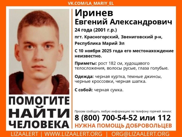 Добровольцы поискового отряда «ЛизаАлерт» в Марий Эл просят помощи в поиске пропавшего поселке Красногорский Звениговского района 24-летнего Евгения Иринева.