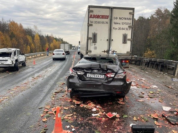 Напомним, авария случилась около 9.40 на 37 км автодороги «Вятка», в месте организации дорожных работ, где движение регулируется светофором, 33-летний водитель Mercedes на скорости не справился с управлением и врезался в стоящую впереди автомашину Газель под управлением 32-летнего водителя, с последующим наездом Газели на автомашину Лада-2131 под управлением 58-летнего водителя, после чего Лада-2131 совершила наезд на Toyota Camry под управлением 45-летнего водителя. После этого Toyota Camry совершила наезд на грузовую автомашину Man.