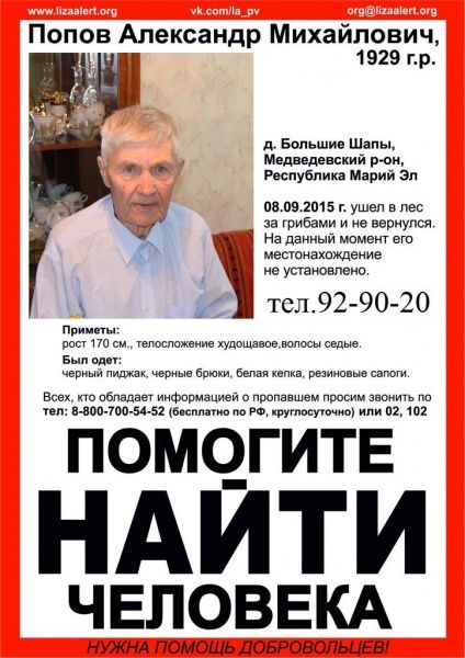 - Пропал мой дед Александр Михайлович Попов 1929 года рождения, - рассказывает Татьяна Губайдуллина. – 8-го сентября он уехал на первом автобусе (на 5.40) из Йошкар-Олы в лес за грибами, уже раз 30-й за это лето! Уехал в тот же самый лес, где часто бывал, начинающийся за деревней Большие Шапы. Он всегда возвращался в тот же день вечером домой на предпоследнем автобусе Шапы - Йошкар-Ола! Но в этот раз не вернулся! Подняли тревогу! Спасатели МЧС сразу приступили к поискам деда, сотрудники МВД из Медведевского УВД тоже подключилось к поискам, но чуть позже, с кинологами. Потом 25 человек снова прочесывали местность, ввели поиски и на следующий день, но безрезультатно! Если кто-то мог видеть дедушку или просто хочет помочь в поисках, пожалуйста, сообщите!