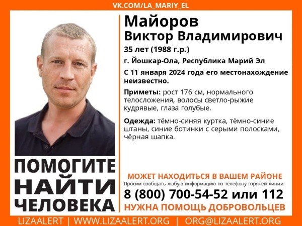 Приметы Виктора Майорова, местонахождение которого неизвестно с 11 января: рост 176 см, нормальное телосложение, волосы светло-рыжие, кудрявые, глаза голубые. Был одет в темно-синюю куртку, темно-синие штаны, синие ботинки с серыми полосками, черную шапку.