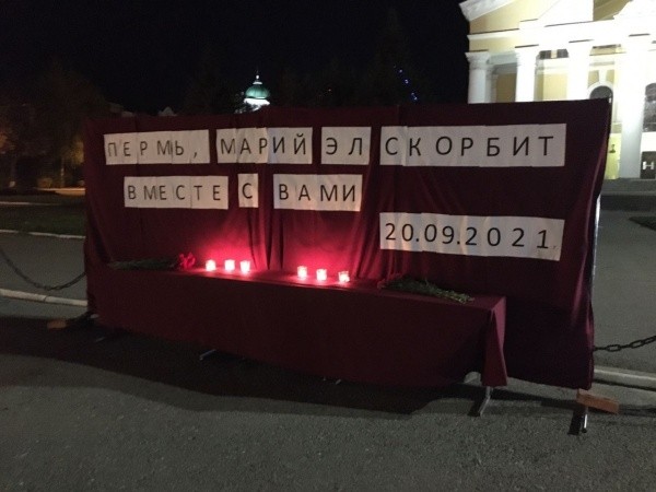 "Пермь, Марий Эл скорбит вместе с вами. 20.09.2021", - гласит надпись на стихийном мемориале. Сегодня вечером те, кто хотел выразить свою скорбь по поводу случившейся трагедии, принесли  сюда букеты алых гвоздик и зажгли свечи.