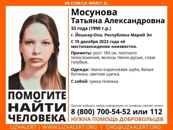 Местонахождение 33-летней Татьяны Александровны Мосуновой неизвестно с 19 декабря.