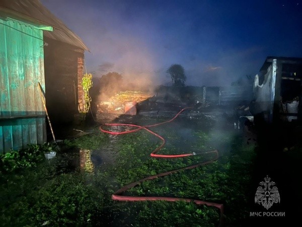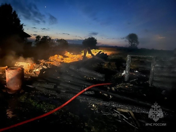 В результате возгорания хлев уничтожен, дом и баня повреждены. Специалисты государственного пожарного надзора устанавливают причину пожара.