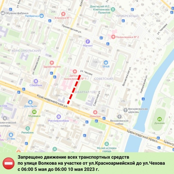 С 06:00 5 мая до 06:00 10 мая для автомобилистов будет закрыта улица Волкова на участке от улицы Красноармейской до улицы Чехова.