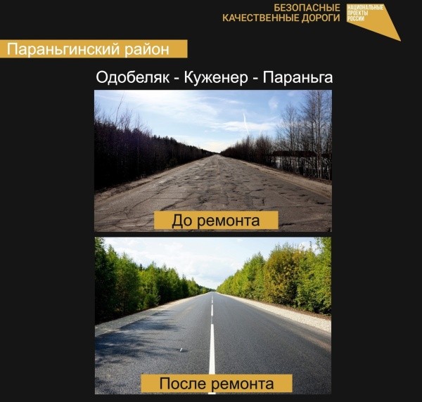 Ремонт дороги в Параньгинском районе обошелся в 250,66 миллиона рублей. Рабочие выполнили фрезерование существующего покрытия, устройство нижнего, среднего и верхнего слоя асфальтобетона, укрепили обочины и отремонтировали трубы, пересечения, примыкания и семь автобусных остановок, а также поставили новые дорожные знаки и барьерные ограждения. Завершающих штрихом стало нанесение разметки.