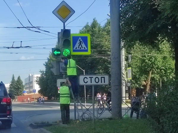 Вчера на перекрестке улиц Первомайской и Ленинского проспекта проходили работы по установке новых секций светофора, и уже ближе к вечеру светофорный объект стал удивлять водителей.