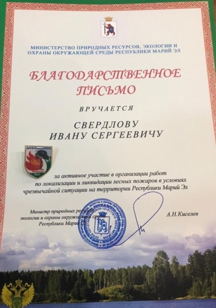 Специалисту Сернурского участка службы производственного контроля УПБ и ПК филиала «Мариэнерго» Ивану Свердлову вручена благодарность Министерства природных ресурсов, экологии и охраны окружающей среды Республики Марий Эл и нагрудный знак отличия «Доброволец 2021» за тушение лесных пожаров.