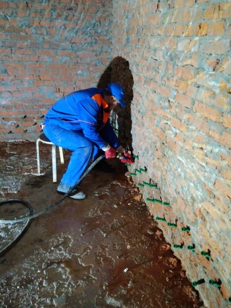 - Далее, производится закачка специализированными инъекционными растворами, используя наносную установку. Периодически, кирпичные стены, в особенности из красного кирпича, предоставляют возможность не производить закачку при давлении, а произвести простую заливку раствора, так как у красного кирпича приличная пористость. В том числе периодически можно не применять инъекционный пакер. Данная методика является допустимой, однако необходимо производить контроль расхода. Минимально расход должен составлять один литр концентрированного раствора на один метр квадратный площади укладки. Расход концентрата может увеличиваться до трёх литров. Однако, не всегда можно обойтись без подачи давления.