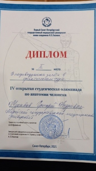 С 12 по 15 мая 2021 года команда студентов Медицинского института по сложившейся доброй традиции приняла участие в Открытой студенческой олимпиаде по анатомии Первого Санкт-Петербургского Государственного Медицинского Университета им. акад. И.П. Павлова.