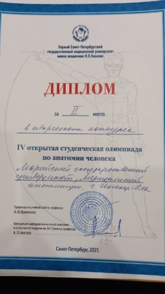Олимпиада состояла из двух этапов – теоретического и практического туров. Студенты МарГУ показали блестящие знания анатомии человека: по результатам олимпиады Мусатов Григорий занял II место в практическом туре, а Вайсс Хассан Амира – II место в теоретическом туре. В общем зачете команда студентов медицинского института МарГУ заняла I командное место.