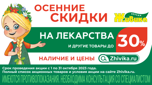 В сети аптек «Живика» в Йошкар-Оле стартовал невероятный осенний ценопад: в октябре – скидки до 30% на лекарственные средства и другие товары. Самые популярные и востребованные продукты можно приобрести, сэкономив на покупке до трети от стоимости. Срок действия акции с 01 по 31 октября 2023.