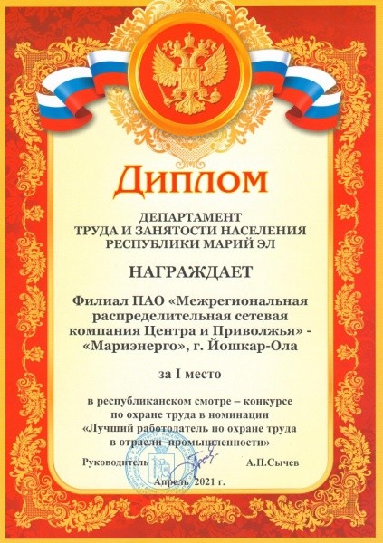 «Россети Центр и Приволжье Мариэнерго» награжден дипломом Департамента труда и занятости   населения Республики Марий Эл за I место в республиканском смотре-конкурсе по охране труда.