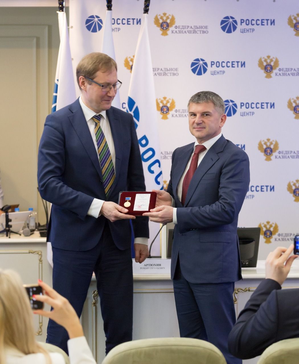 В завершение встречи Роман Артюхин вручил Игорю Маковскому и другим представителям «Россети Центр» награды за активную помощь и содействие в решении задач, возложенных на Федеральное казначейство.