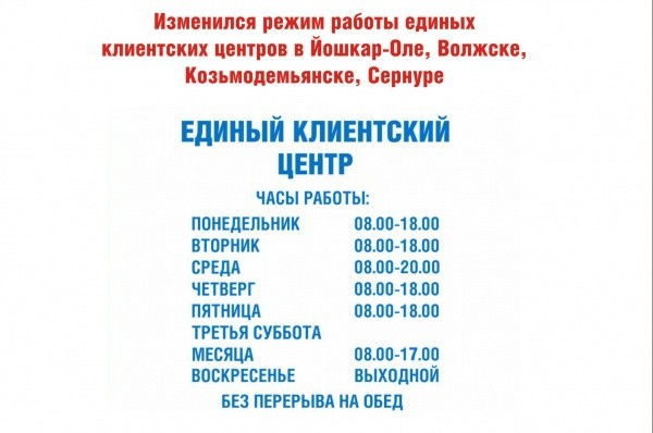 Теперь единые клиентские центры в гг. Йошкар-Ола, Волжск, Козьмодемьянск, п. Сернур будут работать по следующему графику