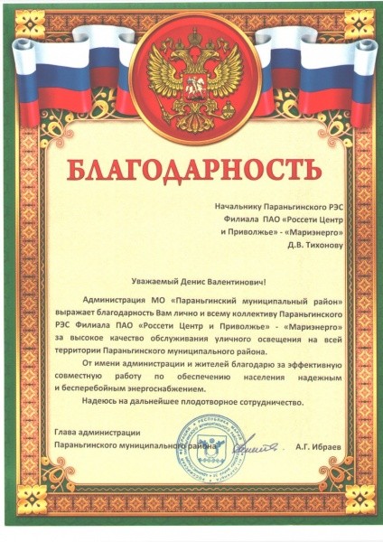 В Параньгинский РЭС поступило благодарственное письмо от главы администрации муниципального образования «Параньгинский муниципальный район» Альфита Ибраева коллективу и начальнику РЭС Денису Тихонову. В нем, в частности, говорится: «Администрация МО «Параньгинский муниципальный район» выражает благодарность всему коллективу Параньгинского РЭС Филиала ПАО «Россети Центр и Приволжье» – «Мариэнерго» за высокое качество обслуживания уличного освещения на всей территории Параньгинского муниципального района. Альфит Габдулхакович поблагодарил энергетиков за эффективную совместную работу и выразил надежду на дальнейшее сотрудничество.
