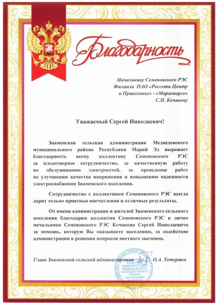 Также энергетиков от имени жителей сельского поселения поблагодарила глава Знаменской сельской администрации Ольга Тетерина и отметила качественную работу по обслуживанию электросетей и содействие в решении вопросов местного значения: «Знаменская сельская администрация Медведевского муниципального района Республики Марий Эл выражает благодарность всему коллективу Семеновского РЭС за плодотворное сотрудничество, за проведение работ по улучшению качества напряжения и повышению надежности электроснабжения Знаменского поселения. Сотрудничество с коллективом Семеновского РЭС всегда дарит только приятные впечатления и отличные результаты», – отмечается в благодарственном письме.