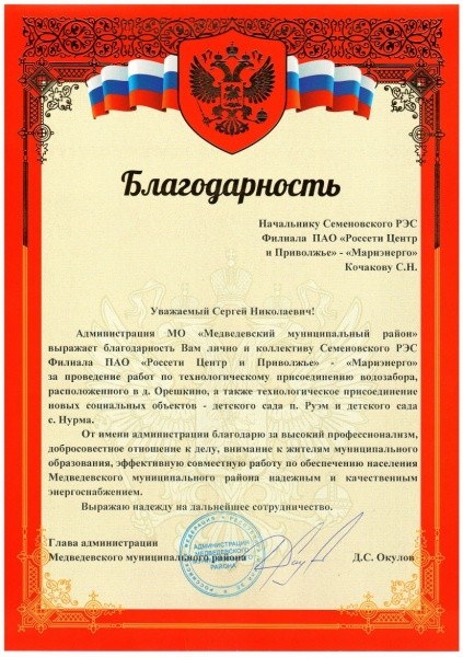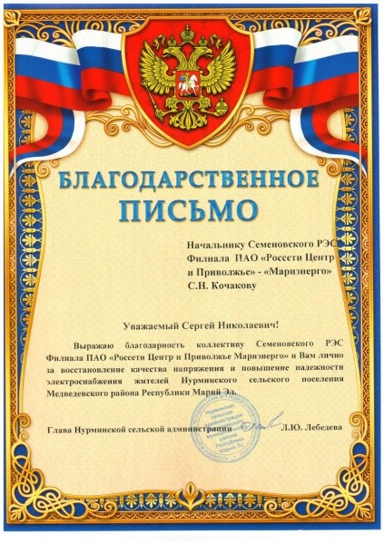 В адрес Филиала ПАО «Россети Центр и Приволжье» – «Мариэнерго» поступили благодарственные письма от Главы администрации муниципального образования «Медведевский муниципальный район», Главы администрации муниципального образования «Параньгинский муниципальный район» и глав администраций сельских поселений Республики Марий Эл.