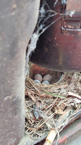 Под капотом трактора расположились четыре яйца. По оценкам орнитологов, процесс развития птенцов трясогузки до стадии вылета займёт месяц. Взрослая птица внимательно следит за людьми и возвращается в гнездо, как только они отходят на безопасное расстояние.