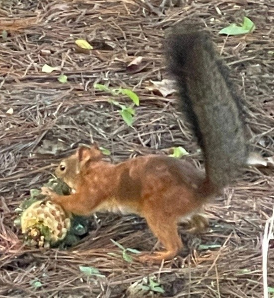 Судя по всему, в период заготовки семян кедровых сосен на лапках у белочек формируется смоляной слой, который забивается растительным сором. Такая смесь твердеет и кристаллизуется, и белка затем без труда счищает её со своих лап ртом.