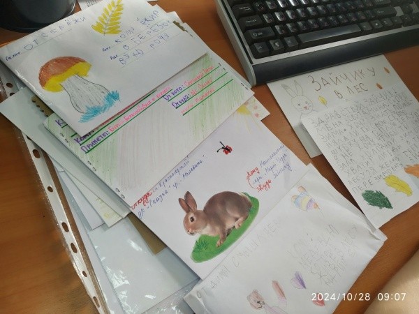 Ребята из садиков «Теремок», «Сказка» и «Солнышко» положили в конверты свои рисунки, поделки и вопросы о жизни животных. Дети задают забавные вопросы, например: «Почему у белки хвост такой пушистый, а у зайца — длинные уши?» или «Как медведь справляется с зимней спячкой, и почему он пропускает новогодние праздники?»