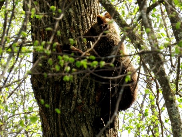 "Самка чувствует запах человека и всегда недовольна. Иногда делает небольшие перебежки в сторону наблюдателя, встает на задние лапы, чтобы лучше видеть и показать свой грозный вид. С ревом падает на 4 лапы и делает быстрые перебежки с места на место, всегда издавая грозный рык. Медвежата в это время забираются высоко на деревья и смотрят в сторону человека. На высокую сосну могут забраться за 20-30 секунд, как африканцы на пальму. Чаще бывает, когда они спускаются каждый со своего дерева, могут вновь забраться, но уже на один ствол. Спускаться им труднее, и они часто мешают друг другу. Конечно, в таких условиях цифровым фотоаппаратом трудно захватить медведей в фокусе, особенно когда много веток и листьев", - поделился своими наблюдениями Геннадий Богданов.