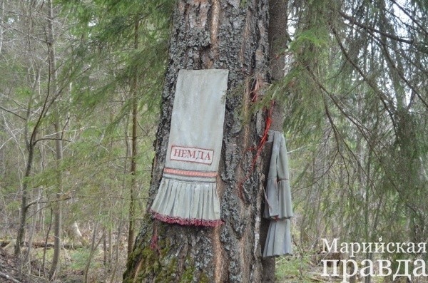 Но теперь у всех в домах стоят стиралки, и люди перестали появляться в этих местах. О присутствии человека напоминает только поленница сгнивших уже дров и платок на огромной березе. На нем вышита надпись «Немда». Лет 10 тому назад здесь побывали общественники из Йошкар-Олы, а ныне покойный карт Вячеслав Актуганов прочитал молитву, обратившись к духу воды. Платок этот с тех пор здесь так и висит, потемнел от времени, но в хорошем состоянии.
