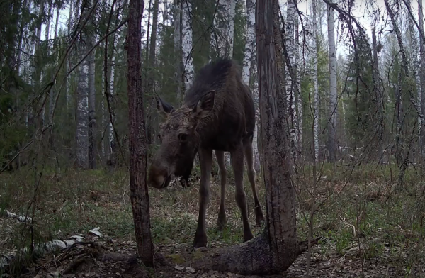 На кадрах видно, что лося чем-то привлекли две елочки. Он старательно изучает стволы деревьев, обнюхивая их.