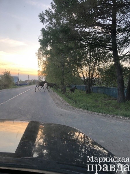 Компания из трех лосей устроила прогулку по центральной - Коммунистической улице села Юледур (Марий Эл) и в итоге стала главным ньюсмейкером для всей округи.