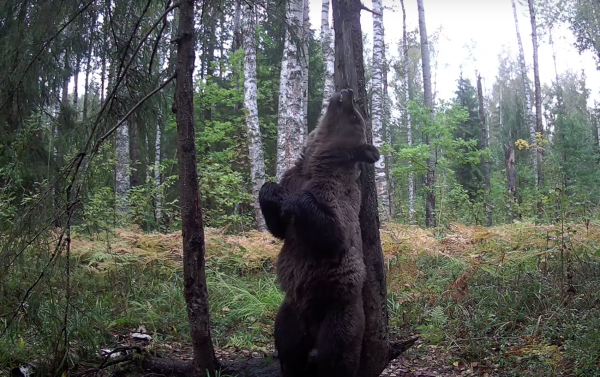 В кадре фотоловушки Альберта Негреску оказался взрослый медведь. Он терся спиной (нет, не о земную ось), в то же время обнюхивая другое дерево.